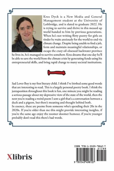Sad Lover Boy is my first literary child. I think I've birthed some good words that are interesting to read. This is a largely personal poetry book. I think the juxtaposition throughout this book is fun, one minute you might be reading a serious passage about my depressive view of the state of the world, then the next you're reading a weird poem I sent a girl that's a conversation between a duck and a pigeon, but there's meaning and thought behind both. In essence, these are poems from someone who's spending their 20s in the 2020s. If you're older than me this might provide interesting insights, if you're the same age enjoy the zoomer doomer humour, if you're younger probably don't read this there's bad words.