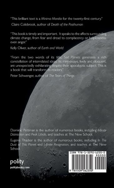 In this series of meditations, Dominic Pettman and Eugene Thacker explore some of the key "negative affects" - both eternal and emergent - associated with climate change, environmental destruction, and cosmic solitude. In so doing they unearth something so obvious that it has gone largely unnoticed: the question of how we should feel about climate change. Between the information gathered by planetary sensors and the simple act of breathing the air, new unsettling moods are produced for which we currently lack an adequate language. Should we feel grief over the loss of our planet? Or is the strange feeling of witnessing mass extinction an indicator that the planet was never "ours" to begin with? Sad Planets explores this relationship between our all-too-human melancholia and a more impersonal sorrow, nestled in the heart of the cosmic elements.