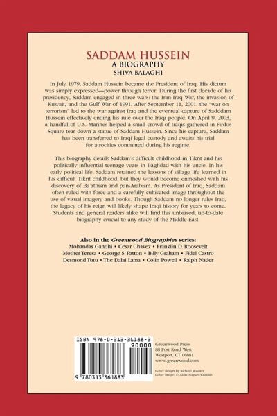 In July 1979, Saddam Hussein became the President of Iraq. His dictum was simply expressed-power through terror. During the first decade of his presidency, Saddam engaged in three wars: the Iran-Iraq War, the invasion of Kuwait, and the Gulf War of 1991. After September 11th, the war on terrorism led to the war against Iraq that began in March 2003 and the eventual capture of Sadddam Hussein effecitively ending his rule over the Iraqi people. On April 9, 2003, a handful of U.S. Marines helped a small crowd of Iraqis gathered in Firdos Square to tear down a statue of Saddam Hussein. Since his capture, Saddam has been transferred to Iraqi legal custody and awaits his trial for atrocities committed during his regime. This biography details Saddam's difficult childhood in Tikrit and his politically influential teenage years in Baghdad with his uncle. His involvement with the Iraqi Ba'ath Party led to his participation in an assassination attempt on then Prime Minister Qassem. In his early political life, Saddam retained the lessons of village life learned in his difficult Tikrit childhood, but they would become enmeshed with his discovery of Ba'athism and pan-Arabism. Once he became President of Iraq, Saddam often ruled with force and a carefully cultivated image throughout the use of visual imagery and books. Though Saddam no longer rules Iraq, the legacy of his reign will likely shape Iraqi history for years to come.