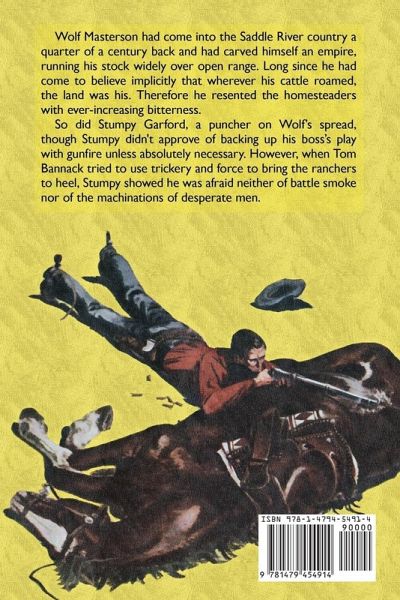 Wolf Masterson had come into the Saddle River country a quarter of a century back and had carved himself an empire, running his stock widely over open range. Long since he had come to believe implicitly that wherever his cattle roamed, the land was his. Therefore he resented the homesteaders with ever-increasing bitterness. So did Stumpy Garford, a puncher on Wolf's spread, though Stumpy didn't approve of backing up his boss' play with gunfire unless absolutely necessary. However, when Tom Bannack tried to use trickery and force to bring the ranchers to heel, Stumpy showed he was afraid neither of battle smoke nor of the machinations of desperate men.