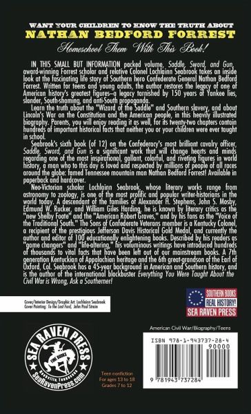 In this small but information packed book, Saddle, Sword, and Gun, Forrest scholar and relative Colonel Lochlainn Seabrook takes an inside look at the fascinating life story of Southern hero Confederate General Nathan Bedford Forrest. Written for teens and young adults (ages 13-18), Colonel Seabrook restores the legacy of one of American history's greatest figures - a legacy tarnished by 150 years of Yankee lies, slander, and anti-South propaganda. Your son or daughter will ride along with Forrest, getting a firsthand look at his childhood in Tennessee, his teens in Mississippi, his marriage and children, his multimillion dollar businesses, the start of the American "Civil War," his enrollment in the Confederate army, and his rise to fame as a daring and successful Rebel officer. They will thrill to the dramatic descriptions of General Forrest's exploits on and off the battlefield as he and his courageous cavalry (which included sixty-four black Confederate soldiers) fought their way across the South defending hearth, home, honor, and the constitutional right of self-government. In the process they will discover why the General's men loved and respected him, why the Southern people looked up to him as their "Spiritual Comforter," and why he freed his slaves years before Lincoln issued his fake and illegal Emancipation Proclamation. After Lincoln's War they will follow Forrest as he rebuilt his life from scratch, and helped the South regain her political power and dignity during the Yankees' cruel and vindictive "Reconstruction" period. Finally they will learn how the great Confederate chieftain lived out his last years campaigning for black civil rights and working to heal the physical and emotional wounds left by the War for Southern Independence. Along the way they will be taught the truth about Forrest and Southern slavery and about Lincoln's War on the Constitution and the American people, a truth that has been hidden for a century and a half by uneducated enemies of the South. Parents, you will enjoy reading this heavily illustrated compact little book as well, for it contains hundreds of important historical facts that neither you or your children were ever taught in school. Colonel Seabrook's sixth book (of nine) on Forrest, Saddle, Sword, and Gun is a significant work that will change hearts and minds regarding one of the most inspirational, gallant, colorful, and riveting figures in world history, a man who to this day is loved by millions of people of all races around the globe: famed Tennessean Nathan Bedford Forrest! Available in paperback and hardcover. Civil War scholar Lochlainn Seabrook, a descendant of the families of Alexander H. Stephens and John S. Mosby, is the most prolific and popular pro-South writer in the world today. Known as the "new Shelby Foote," he is a recipient of the prestigious Jefferson Davis Historical Gold Medal and the author of over 50 books that have introduced hundreds of thousands to the truth about the War for Southern Independence. A seventh-generation Kentuckian of Appalachian heritage and the sixth great-grandson of the Earl of Oxford, Colonel Seabrook has a forty-year background in American and Southern history, and is the author of the international blockbuster Everything You Were Taught About the Civil War is Wrong, Ask a Southerner! His other titles include: Confederate Flag Facts; The Great Yankee Coverup; Everything You Were Taught About American Slavery is Wrong, as a Southerner!; Slavery 101; Confederacy 101; Give This Book to a Yankee; Honest Jeff and Dishonest Abe: A Southern Children's Guide to the Civil War; Women in Gray: A Tribute to the Women Who Supported the Southern Confederacy; and The Quotable Nathan Bedford Forrest.
