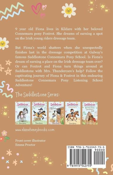 9 year old Fiona lives in Kildare with her beloved Connemara pony Foxtrot. She dreams of earning a spot on the Irish young riders dressage team. But Fiona's world shatters when she unexpectedly finishes last in the dressage competition at Galway's famous Saddlestone Connemara School. Is Fiona's dream of earning a place on the Irish dressage team over? Or can Foxtrot and Fiona turn things around at Saddlestone with Mrs. Thundercare's help? Follow the captivating journey of Fiona & Foxtrot in this endearing Saddlestone Connemara Pony Listening School Adventure! This wholesome and beautifully told horse story is perfect for horse-crazy kids aged 7 upwards. Written by international horsewoman and award-winning documentary director, Elaine Heney, this tender and touching story explores the depth of the relationship that can be created between child and pony - that can last a lifetime. This book includes educational horsemanship and horse training lessons, including tips on collection, softness, self-carriage and horsemanship, based on the principles of good horsemanship. This is the perfect children's equestrian book and gift for young readers, girls, boys and all who love great horse stories to curl up with and enjoy. By listening to the horse everything becomes possible.
