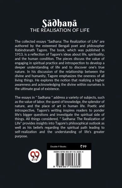 The collected essays "Sadhana: The Realization of Life" are authored by the esteemed Bengali poet and philosopher Rabindranath Tagore. The book, which was published in 1913, is a reflection of Tagore's ideas about life, spirituality, and the human condition. The pieces discuss the value of engaging in spiritual practice and introspection to develop a deeper understanding of life and to discover one's true nature. In his discussion of the relationship between the divine and humanity, Tagore emphasizes the oneness of all living things. He explores the notion that realizing a higher awareness and acknowledging the divine within ourselves is the ultimate goal of existence. The essays in " Sadhana " address a variety of subjects, such as the value of labor, the quest of knowledge, the splendor of nature, and the place of art in human life. Poetic and introspective, Tagore's writing inspires readers to ponder life's bigger questions and investigate the spiritual side of things. All things considered, " Sadhana: The Realization of Life" provides insights into Tagore's philosophical outlook as well as his beliefs regarding the spiritual path leading to self-realization and the understanding of life's greater purpose.