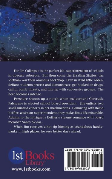 For Jim Collings it is the perfect job--superintendent of schools in upscale suburbia. But then come the Sizzling Sixties, the Vietnam War their ominous backdrop. Even in staid little Arden, defiant students protest and demonstrate, get hooked on drugs, call in bomb threats, and line up with subversive groups. The heat becomes intense. Pressure shoots up a notch when malcontent Gertrude Palsgrave is elected school board president. She enlists two small-minded cohorts in her machinations. Conniving with Ralph Keffler, assistant superintendent, they make Jim's life miserable. Adding to the intrigue is Keffler's steamy romance with board member Nancy Skylar. When Jim receives a hot tip hinting at scandalous hanky-panky in high places, he sees better days ahead.