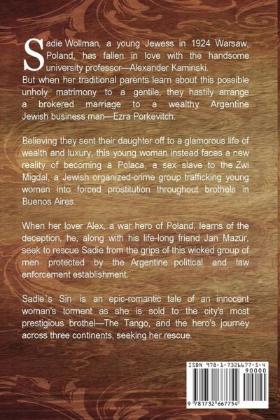Sadie Wollman, a young Jewess in 1924 Warsaw, Poland, has fallen in love with the handsome university professor-Alexander Kaminski. But when her traditional parents learn about this possible unholy matrimony to a gentile, they hastily arrange a brokered marriage to a wealthy Argentine Jewish business man-Ezra Porkevitch. Believing they sent their daughter off to a glamorous life of wealth and luxury, this young woman instead faces a new reality of becoming a Polaca, a sex slave to the Zwi Migdal, a Jewish organized-crime group trafficking young women into forced prostitution throughout brothels in Buenos Aires. When her lover Alex, a war hero of Poland, learns of the deception, he, along with his life-long friend Jan Mazur, seek to rescue Sadie from the grips of this wicked group of men protected by the Argentine political and law enforcement establishment. Sadie's Sin is an epic-romantic tale of an innocent woman's torment as she is sold to the city's most prestigious brothel-The Tango, and the hero's journey across three continents, seeking her rescue.