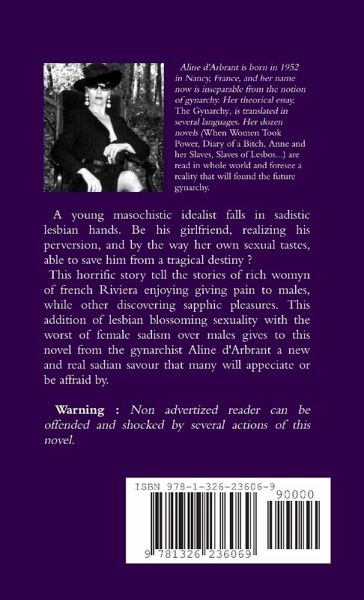 A young masochistic idealist falls in sadistic lesbian hands. Be his girlfriend, realizing his perversion, and by the way her own sexual tastes, able to save him from a tragical destiny ? This horrific story tell the stories of rich womyn of french Riviera enjoying giving pain to males, while other discovering sapphic pleasures. This addition of lesbian blossoming sexuality with the worst of female sadism over males gives to this novel from the gynarchist Aline d'Arbrant a new and real sadian savour that many will appeciate or be affraid by. Warning : Non advertized reader can be offended and shocked by several actions of this novel.