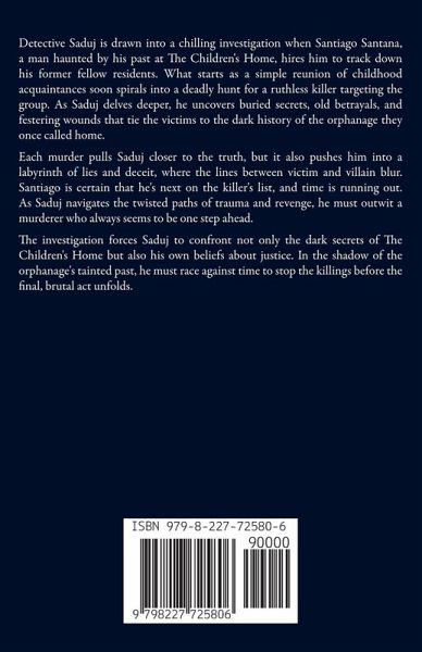 Detective Saduj is drawn into a chilling investigation when Santiago Santana, a man haunted by his past at The Children's Home, hires him to track down his former fellow residents. What starts as a simple reunion of childhood acquaintances soon spirals into a deadly hunt for a ruthless killer targeting the group. As Saduj delves deeper, he uncovers buried secrets, old betrayals, and festering wounds that tie the victims to the dark history of the orphanage they once called home. Each murder pulls Saduj closer to the truth, but it also pushes him into a labyrinth of lies and deceit, where the lines between victim and villain blur. Santiago is certain that he's next on the killer's list, and time is running out. As Saduj navigates the twisted paths of trauma and revenge, he must outwit a murderer who always seems to be one step ahead. The investigation forces Saduj to confront not only the dark secrets of The Children's Home but also his own beliefs about justice. In the shadow of the orphanage's tainted past, he must race against time to stop the killings before the final, brutal act unfolds.