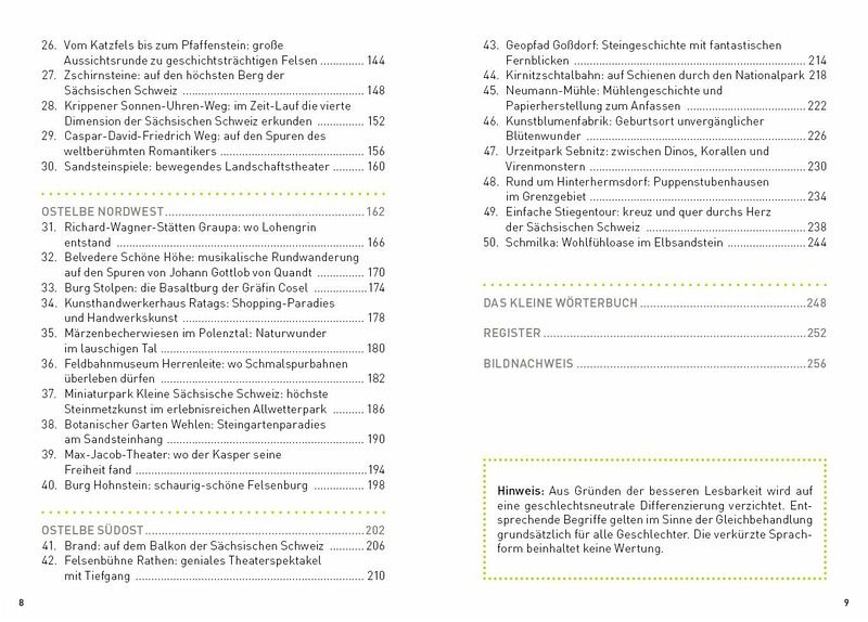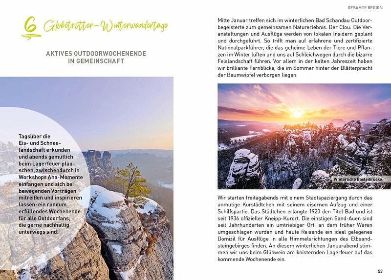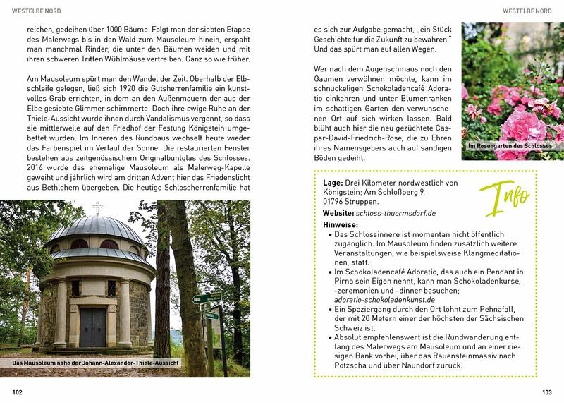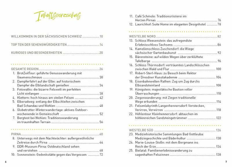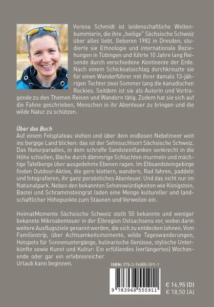 Auf einem Felsplateau stehen und über dem endlosen Nebelmeer weit ins bergige Land blicken: das ist der Sehnsuchtsort Sächsische Schweiz. Das Naturparadies, in dem schroffe Sandsteinflanken senkrecht in die Höhe schießen, Bäche durch dämmrige Schluchten murmeln und mächtige Tafelberge über ausgedehnte Ebenen ragen. Im Elbsandsteingebirge finden Outdoor-Aktive, die gern klettern, wandern, Rad fahren, paddeln und fotografieren, ihr ganz persönliches Abenteuer. Und das nicht nur im Nationalpark. Neben den bekannten Sehenswürdigkeiten wie Königstein, Bastei und Schrammsteingrat laden eine Menge kultureller und landschaftlicher Höhepunkte zum Staunen und Verweilen ein.HeimatMomente Sächsische Schweiz stellt 50 bekannte und weniger bekannte Mikroabenteuer in der Elbregion Ostsachsens vor, wobei darin weitere Ausflugsziele genannt werden, die sich zu entdecken lohnen. Vom Familientrip, über Achtsamkeitsmomente, wilde Tageswanderungen, Hotspots für Sonnenuntergänge, kulinarische Genüsse,stylische Unterkünfte sowie Kunst und Kultur: Ein erfüllendes (verlängertes) Wochenende oder gar ein erlebnisreicher Urlaub kann beginnen.