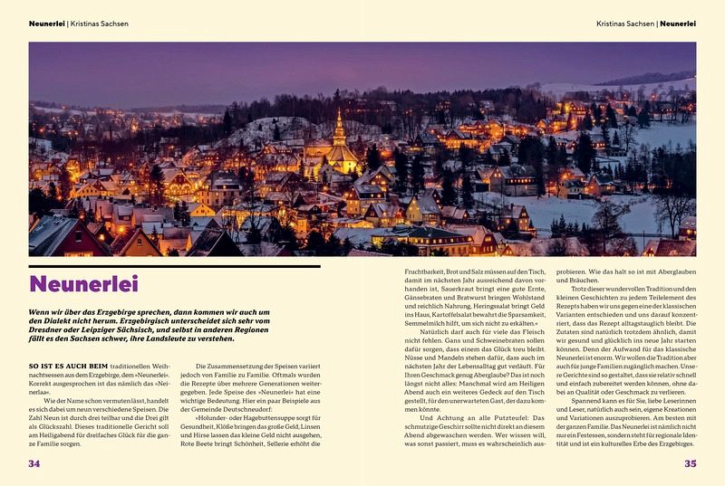 Besonders gelungen finde ich die kleinen Reportagen, die zwischen den Rezepten eingeschoben sind. Sie erklären Hintergründe, wie bei der Eierschecke, die offenbar tatsächlich nur in Ostdeutschland bekannt ist. Auch das Kapitel zum Erzgebirge mit dem traditionellen Weihnachtsgericht „Neinerlei“ hat mir gefallen. Hier zeigen die Autoren eine moderne Variante, die schneller auf dem Tisch steht, ohne die Tradition aus den Augen zu verlieren. Ebenso originell: der Winterapfelstollen aus dem Glas – perfekt als Mitbringsel in der Adventszeit. Wenn dann noch vom „Weihnachtswunderland Sachsen“ erzählt wird, steigt bei mir sofort die Lust, die Region wieder einmal zu bereisen.