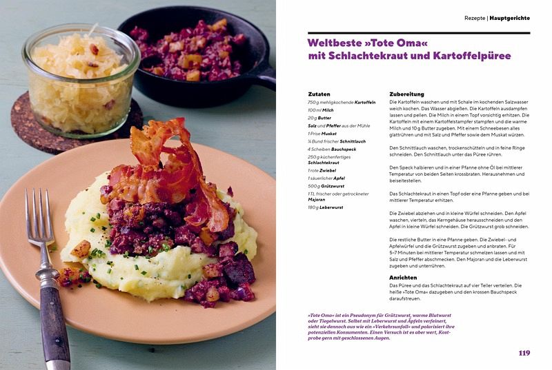 Viele Rezepte weckten bei mir Kindheitserinnerungen. „Tote Oma“ etwa – damals schmeckte mir die Blutwurst, weil ich noch gar nicht wusste, was es war. Heute ist es nichts mehr für mich, aber interessant ist, dass das Buch eine Variante mit Grützwurst und Leberwurst anbietet. Überhaupt gefällt mir, dass die Autoren häufig moderne Abwandlungen präsentieren, die altbekannten Gerichten neuen Pfiff verleihen. Ein Beispiel sind die Streuselkuchen-Cupcakes mit Puddingfüllung – eine charmante Weiterentwicklung des klassischen Kuchens. Für mich persönlich spannender als „Tote Oma“ sind Rezepte wie diese, die Tradition und Moderne miteinander verbinden.