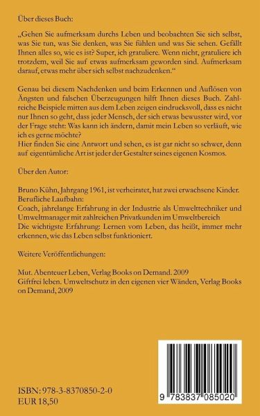 Über dieses Buch:"Gehen Sie aufmerksam durchs Leben und beobachten Sie sich selbst, was Sie tun, was Sie denken, was Sie fühlen und was Sie sehen. Gefällt Ihnen alles so, wie es ist? Super, ich gratuliere. Wenn nicht, gratuliere ich trotzdem, weil Sie auf etwas aufmerksam geworden sind. Aufmerksam darauf, etwas mehr über sich selbst nachzudenken."Genau bei diesem Nachdenken und beim Erkennen und Auflösen von Ängsten und falschen Überzeugungen hilft Ihnen dieses Buch. Zahlreiche Beispiele mitten aus dem Leben zeigen eindrucksvoll, dass es nicht nur Ihnen so geht, dass jeder Mensch, der sich etwas bewusster wird, vor der Frage steht: Was kann ich ändern, damit mein Leben so verläuft, wie ich es gerne möchte?Hier finden Sie eine Antwort und sehen, es ist gar nicht so schwer, denn auf eigentümliche Art ist jeder der Gestalter seines eigenen Kosmos.