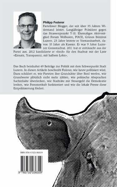 "säuhäfeli-säudeckeli" beinhaltet 49 Beiträge zur Politik. In diesen Artikeln beschreibt Philipp Federer, wie heute politisiert wird. Dazu schildert er, wie Parteien ihre Grundsätze über Bord werfen, wie Grundwerte plötzlich nicht mehr zählen, wie politische Absprachen Sachinhalte überdecken, wie Stadträte mit Steuergeld die Demokratie lenken, wie Personenkult funktioniert und wie die lokale Presse diese Entpolitisierung fördert.Der parteilose Blogger schreibt über seine politischen Erfahrungen, die von 35 Jahre Widerstandsarbeit geprägt sind. Die Beiträge entlarven die verbreitete idealisierte Vorstellung von Demokratie. Bei seiner Arbeit erschliesst sich ihm u. a., warum Luzern die tiefsten Holdingsteuersätze hat und der Stadtpräsident für einen Ölhändler ein Begnadigungsgesuch schreibt. "Politik" ist nicht schön! Dies zeigen die vielen Politskandale in Zürich, Zug und die Justizskandale im Kanton Schwyz, das "rote Buch" in Obwalden, Justizfehler im Kachelmannprozess, Stuttgart21, Wutbürger in Italien und das Buch von Kurt Marti zum Parteifilz im Kanton Wallis. Die "Luzerner" Kolumnen passen ins interkantonale und internationale Bild der Politik. Parteifilz, Neid, Intrigen überlagern demokratische und solidarische Anliegen. Die Medien verpassen dies zu analysieren. Sie zelebrieren gerne den Personenkult. Damit verkennen sie ihre Rolle als ausgleichende vierte Staatsgewalt.128 Seiten brutto33 farbige Seiten mit Fotos und Grafiken49 Artikel mit Vorwort und weiteren Hinweisen