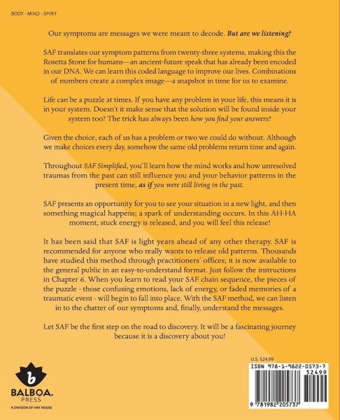 Our symptoms are messages we were meant to decode. But are we listening? SAF® translates our symptom patterns from twenty-three systems, making this the Rosetta Stone for humans-an ancient-future speak that has already been encoded in our DNA. We can learn this coded language to improve our lives. Combinations of numbers create a complex image-a snapshot in time for us to examine. Life can be a puzzle at times. If you have any problem in your life, this means it is in your system. Doesn't it make sense that the solution will be found inside your system too? The trick has always been how you find your answers? Given the choice, each of us has a problem or two we could do without. Although we make choices every day, somehow the same old problems return time and again. Throughout this book, you'll learn how the mind works and how unresolved traumas from the past can still influence you and your behavior patterns in the present time. SAF® presents an opportunity for you to see your situation in a new light, and then something magical happens; a spark of understanding occurs. In this ah-ha! moment, stuck energy is released, and you will feel it! Thousands have studied this method of self-awareness through practitioners' offices. It is now available to the general public in an easy-to-understand format. Just follow the instructions. When you learn to read your SAF® chain sequence, the pieces of the puzzle, those confusing emotions, lack of energy, or faded memories of a traumatic event will begin to fall into place. Let SAF® be the first step on the road to discovery. It will be a fascinating journey because it is a discovery about you!