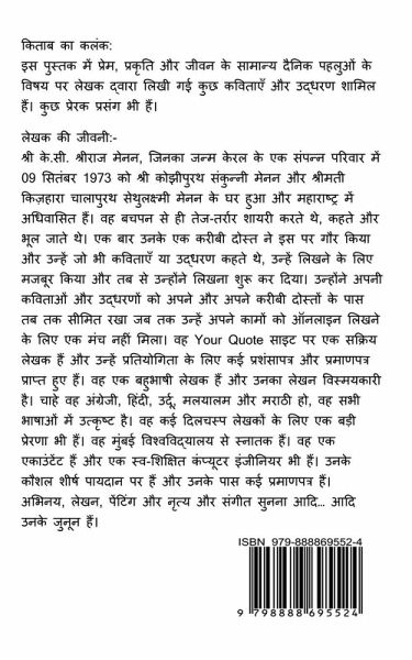 This book consists of some of the poems and Quotes written by the author on the theme of Love, Nature and general day to day aspects of life. There are some inspirational quotes too. Love includes Love found, Love lost and love re-awakened. Similarly, Nature consists of the importance of nature and how people mis-utilize the nature to their own advantages without going for the aftereffects. General consists of the general aspects of life which goes on with people and the surroundings.