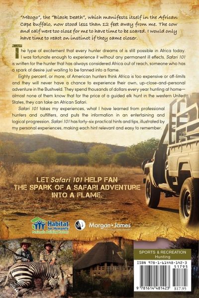 Mbogo, the Black Death, which manifests itself in the African Cape buffalo, now stood less than 12 feet away from me. The cow and calf were too close for me to have time to be scared. I would only have time to react on instinct if they came closer. That is the type of excitement that every hunter dreams of and it is still possible in Africa today. It is also one that I was fortunate enough to experience without any permanent ill effects. Eighty percent or more of American hunters think that Africa is too expensive or off-limits and that they will never have a chance to experience their own, up-close-and-personal adventure in the African bushveld. Safari 101 proves just the opposite. Safari 101 is written for the hunter that has always considered Africa out of reach, someone who has a spark of desire just waiting to be fanned into a flame. American hunters spend thousands of dollars every year hunting at home. Almost none of them know that, for the price of a guided elk hunt in the western United States, they can take an African Safari. The myths of being too expensive and too difficult are firmly entrenched in many hunters minds. Safari 101 has forty-six hints dispersed throughout 11 chapters and proves these myths false. Personal experiences are used to illustrate the value of each hint and to make each one easy to remember. Safari 101 takes the author's experiences, and what he learned from professional hunters and outfitters, and puts the information in a logical progression that is entertaining as well as informative. Safari 101 will help fan the spark into a flame.