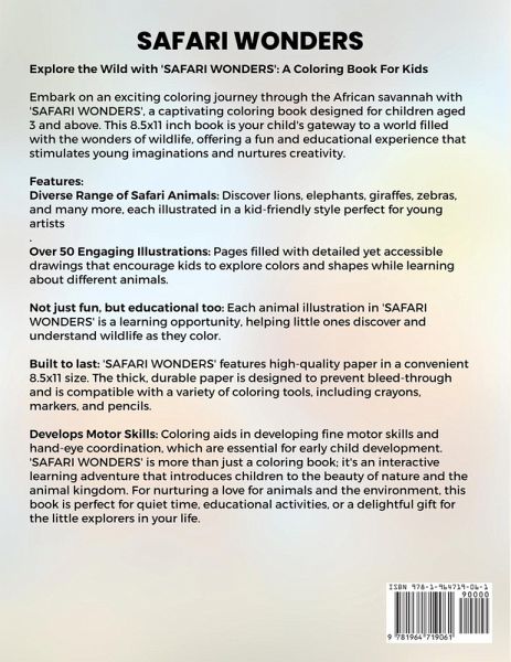 Explore the Wild with 'SAFARI WONDERS': A Coloring Book for Kids 3+ with 50+ illustrations Embark on an exciting coloring journey through the African savannah with 'SAFARI WONDERS', a captivating coloring book for children aged 3 and above. This 8.5x11 inch book is your child's gateway to a world filled with the wonders of wildlife, offering a fun and educational experience that stimulates young imaginations and nurtures creativity. Features:Diverse Range of Safari Animals: Discover lions, elephants, giraffes, zebras, and many more, each illustrated in a kid-friendly style for young artists. Over 50 Engaging Illustrations: Pages filled with detailed yet accessible drawings that encourage kids to explore colors and shapes while learning about different animals. Educational and Fun: Each animal illustration is helping little ones learn about wildlife as they color. High-quality paper in a Convenient 8.5x11 Size: Thick, durable paper to prevent bleed-through, compatible with various coloring tools, including crayons, markers, and pencils. Develops Motor Skills: Coloring aids in developing fine motor skills and hand-eye coordination, essential for early child development. 'SAFARI WONDERS' is more than just a coloring book; it's an interactive learning adventure that introduces children to the beauty of nature and the animal kingdom. Ideal for nurturing a love for animals and the environment, this book is perfect for quiet time, educational activities, or as a delightful gift for the little explorers in your life. Get your copy today and let your child's safari adventure begin in this beautifully sized 8.5x11 coloring book!