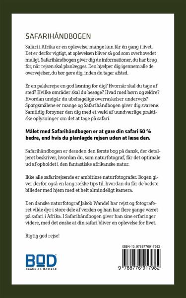 Safari i Afrika er en oplevelse, mange kun får én gang i livet. Det er derfor vigtigt, at oplevelsen bliver så god som overhovedet muligt. Safarihåndbogen giver dig de informationer, du har brug for, når rejsen skal planlægges. Den hjælper dig igennem alle de overvejelser, du bør gøre dig, inden du tager afsted. Er en pakkerejse en god løsning for dig? Hvornår skal du tage afsted? Hvilke områder skal du besøge? Hvad med børn og ældre? Hvordan undgår du ubehagelige overraskelser undervejs? Spørgsmålene er mange og Safarihåndbogen giver dig svarene. Samtidig forsyner den dig med et væld af uundværlige praktiske oplysninger om det at tage på safari. Målet med Safarihåndbogen er at gøre din safari 50 % bedre, end hvis du planlagde rejsen uden at læse den. Safarihåndbogen er desuden den første bog på dansk, der detaljeret beskriver, hvordan du, som naturfotograf, får det optimale ud af opholdet i den fantastiske afrikanske natur. Ikke alle safarirejsende er ambitiøse naturfotografer. Bogen giver derfor også en lang række tips til, hvordan du får de bedste billeder med hjem med et helt almindeligt kamera. Den danske naturfotograf Jakob Wandel har rejst og fotograferet vilde dyr i store dele af verden og han har flere gange været på safari i Afrika. I Safarihåndbogen giver han sine erfaringer videre, med det ønske at din safari bliver en oplevelse for livet. Rigtig god rejse!