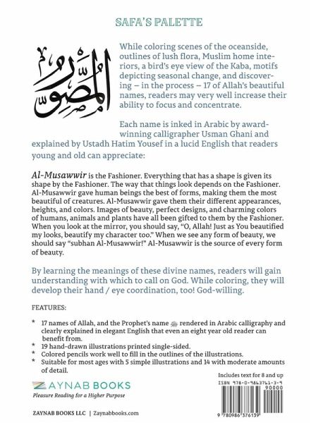 Prophetic tradition tells us that people who remember Allah's 99 names well will enter Paradise. Kids can learn the names gradually and develop their understanding of who God is and what He does. In Safa's Palette: Coloring and Vocabulary Book of Allah's Names, educator Ustadh Hatim Yousef defines 17 of Allah's names in a lucid English that readers young and old can appreciate. Each name is also inked in elegant thuluth script by award-winning calligrapher Usman Ghani. By learning their meanings, readers will gain understanding and names with which to call on God. And don't forget, this is also a coloring book with hand-drawn illustrations by Sanah Z. Shan, showing scenes of the oceanside, and lush flora, of Muslim home interiors, of mosques, and a bird's eye view of the Kaba, as well as motifs of seasonal change. Within most of these, the names are also subtly hidden, waiting for readers to discover them. While coloring, children will develop their hand / eye coordination, too!