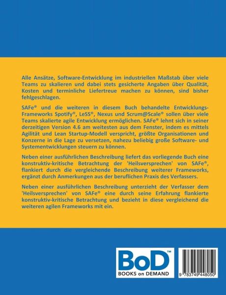 Alle Ansätze, Software-Entwicklung im industriellen Maßstab über viele Teams zu skalieren und dabei stets gesicherte Angaben über Qualität, Kosten und terminliche Liefertreue machen zu können, sind bisher fehlgeschlagen.SAFe® und die weiteren in diesem Buch behandelte Entwicklungs-Frameworks Spotify®, LeSS®, Nexus und Scrum@Scale® sollen über viele Teams skalierte agile Entwicklung ermöglichen. SAFe® lehnt sich in seiner derzeitigen Version 4.6 am weitesten aus dem Fenster, indem es mittels Agilität und Lean Startup-Modell verspricht, größte Organisationen und Konzerne in die Lage zu versetzen, nahezu beliebig große Software- und Systementwicklungen steuern zu können.Neben einer ausführlichen Beschreibung liefert das vorliegende Buch eine konstruktiv-kritische Betrachtung der 'Heilsversprechen' von SAFe®, flankiert durch die vergleichende Beschreibung weiterer Frameworks und ergänzt durch Anmerkungen aus der beruflichen Praxis des Verfassers.