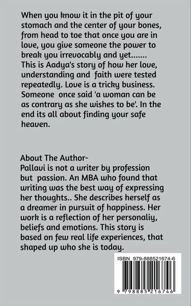 When you know it in the pit of your stomach and the center of your bones, from head to toe that once you are in love you give someone the power to break you irrevocably and yet…This is Aadya's story of how her love, understanding and faith were tested repeatedly. Love is a tricky business, as someone said a woman can be as contrary as she wishes to be. In the end its all about finding your safe heaven. This story is based on few true events that inspired the writer to pen it down.