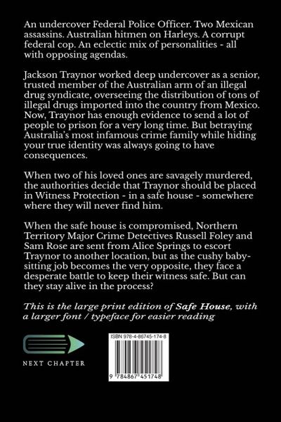 An undercover Federal Police Officer. Two Mexican assassins. Australian hitmen on Harleys. A corrupt federal cop. An eclectic mix of personalities - all with opposing agendas. Jackson Traynor worked deep undercover as a senior, trusted member of the Australian arm of an illegal drug syndicate, overseeing the distribution of tons of illegal drugs imported into the country from Mexico. Now, Traynor has enough evidence to send a lot of people to prison for a very long time. But betraying Australia's most infamous crime family while hiding your true identity was always going to have consequences. When two of his loved ones are savagely murdered, the authorities decide that Traynor should be placed in Witness Protection - in a safe house - somewhere where they will never find him. When the safe house is compromised, Northern Territory Major Crime Detectives Russell Foley and Sam Rose are sent from Alice Springs to escort Traynor to another location, but as the cushy baby-sitting job becomes the very opposite, they face a desperate battle to keep their witness safe. But can they stay alive in the process? This is the large print edition of Safe House, with a larger font / typeface for easier reading.