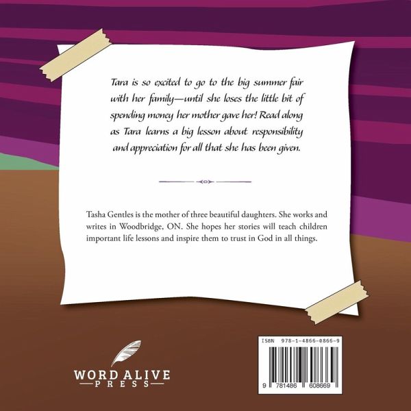 Tara is so excited to go to the big summer fair with her family-until she loses the little bit of spending money her mother gave her! Read along as Tara learns a big lesson about responsibility and appreciation for all that she has been given. About the Author Tasha Gentles is the mother of three beautiful daughters. She works and writes in Woodbridge, ON. She hopes her stories will teach children important life lessons and inspire them to trust in God in all things.
