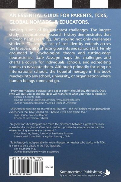 "Moving is one of life's greatest challenges. The largest study in educational research history demonstrates that moving harms learning. But moving not only challenges students. The experience of lost identity extends across the lifespan, also affecting parents and school staff. Firmly grounded in psychological theory and cutting-edge neuroscience, Safe Passage maps the challenges and charts a course for individuals, schools, and accrediting bodies to navigate them. Although primarily focusing on international schools, the hopeful message within this book reaches into any school, university, or organization where human beings come and go." BACK COVER REVIEWS "Every international educator and expat parent should buy this book. Ota's style will pull you in and his ideas will transform what you think is possible." Barbara F. Schaetti, Ph.D. Founder, Personal Leadership Seminars (www.plseminars.com) Author, Personal Leadership: Making a World of Difference "Safe Passage took me on an emotional journey - one that helped me understand the experiences that have shaped me. I believe it will help others too." Jane Larsson, Executive Director Council of International Schools "A good Transition Program can make the difference between a great experience abroad and a rough one. Ota's book makes it possible for one person to start the wheels turning anywhere in the world." Chica Strauszer, Parent, Founder of Transitions Program International School Nido de Aguilas, Santiago, Chile "Safe Passage is indispensable for every therapist or teacher who works with TCKs... it is sure to be a classic in the TCK literature." Lois J Bushong, M.S. Author, Belonging Everywhere & Nowhere