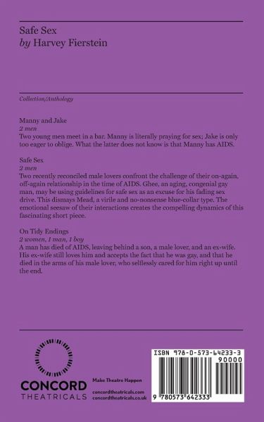 A collection containing the following three plays by Harvey Fierstein: Manny and Jake Two young men meet in a bar. Manny is literally praying for sex; Jake is only too eager to oblige. What the latter does not know is that Manny has AIDS. Safe Sex Two recently reconciled male lovers confront the challenge of their on-again, off-again relationship in the time of AIDS. Ghee, an aging, congenial gay man, may be using guidelines for safe sex as an excuse for his fading sex drive. This dismays Mead, a virile and no-nonsense blue-collar type. The emotional seesaw of their interactions creates the compelling dynamics of this fascinating short piece. On Tidy Endings A man has died of AIDS, leaving behind a son, a male lover, and an ex-wife. She still loves him and accepts the fact that he was gay, and that he died in the arms of his male lover, who selflessly cared for him right up until the end.