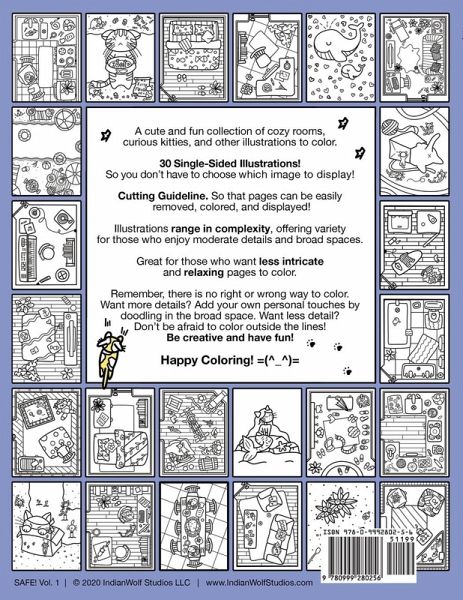 A cute and fun collection of cozy rooms, curious kitties, and other illustrations to color. 30 Single-Sided Illustrations! So you don't have to choose which image to display! Cutting Guideline. So that pages can be easily removed, colored, and displayed! Illustrations range in complexity, offering variety¿ for those who enjoy moderate details and broad spaces. Great for those who want less intricate and relaxing pages to color. Remember, there is no right or wrong way to color. Want more details? Add your own personal touches by doodling in the broad space. Want less detail? Don't be afraid to color outside the lines!¿ Be creative and have fun! Printed on: 8.5"x11" 70 lb White Paper Happy Coloring! =(^_^)=