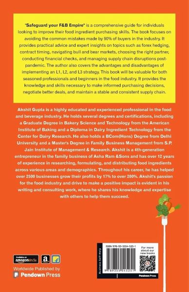 "Safeguard your F&B Empire" is a comprehensive guide for individuals looking to improve their food ingredient purchasing skills. The book focuses on avoiding the common mistakes made by 90% of buyers in the industry. It provides practical advice and expert insights on topics such as forex hedging, contract timing, navigating bull and bear markets, choosing the right partner, conducting financial checks, and managing supply chain disruptions post-pandemic. The author also covers the advantages and disadvantages of implementing an L1, L2, and L3 strategy. This book will be valuable for both seasoned professionals and beginners in the food industry. It provides the knowledge and skills necessary to make informed purchasing decisions, negotiate better deals, and maintain a stable and consistent supply chain. Akshit Gupta is a highly educated and experienced professional in the food and beverage industry. He holds several degrees and certifications, including a Graduate Degree in Bakery Science and Technology from the American Institute of Baking and a Diploma in Dairy Ingredient Technology from the Center for Dairy Research. He also holds a BCom(Hons) Degree from Delhi University and a Master's Degree in Family Business Management from S.P. Jain Institute of Management & Research. Akshit is a 4th-generation entrepreneur in the family business of Asha Ram &Sons and has over 12 years of experience in researching, formulating, and distributing food ingredients across various areas and demographics. Throughout his career, he has helped over 2500 businesses grow their profits by 17% to over 200%. Akshit's passion for the food industry and drive to make a positive impact is evident in his writing and consulting work, where he shares his knowledge and expertise with others to help them succeed.