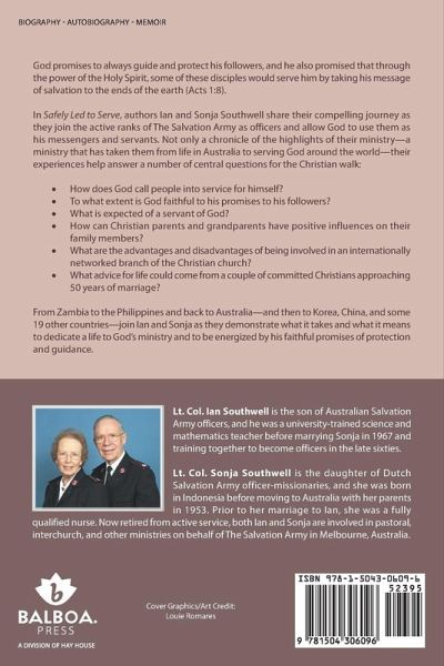 God promises to always guide and protect his followers, and he also promised that through the power of the Holy Spirit, some of these disciples would serve him by taking his message of salvation to the ends of the earth (Acts 1:8). In Safely Led to Serve, authors Ian and Sonja Southwell share their compelling journey as they join the active ranks of The Salvation Army as officers and allow God to use them as his messengers and servants. Not only a chronicle of the highlights of their ministry-a ministry that has taken them from life in Australia to serving God around the world-their experiences help answer a number of central questions for the Christian walk: ¿ How does God call people into service for himself? ¿ To what extent is God faithful to his promises to his followers? ¿ What is expected of a servant of God? ¿ How can Christian parents and grandparents have positive influences on their family members? ¿ What are the advantages and disadvantages of being involved in an internationally networked branch of the Christian church? ¿ What advice for life could come from a couple of committed Christians approaching 50 years of marriage? From Zambia to the Philippines and back to Australia-and then to Korea, China, and some 19 other countries-join Ian and Sonja as they demonstrate what it takes and what it means to dedicate a life to God's ministry and to be energized by his faithful promises of protection and guidance.