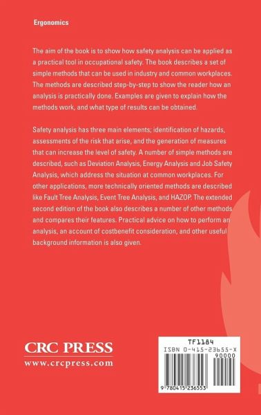 Safety analysis can be applied as a practical tool in occupational safety. It has three main elements: the identification of hazards, the assessment of risks that arise, and the generation of measures to increase the level of safety. A number of simple methods are described that can be used in industry and the workplace, such as deviation analysis, energy analysis and job safety analysis, which address risks in ordinary workplaces. For special cases, more technically oriented methods are presented, such as fault tree analysis, event tree analysis, and HAZOP. The book describes a number of other methods and compares their features. These methods are set out in a step by step manner and practical advise is given on how to perform an analysis. Cost-benefit considerations and other useful background information, such as types of results which can be obtained, are also given.