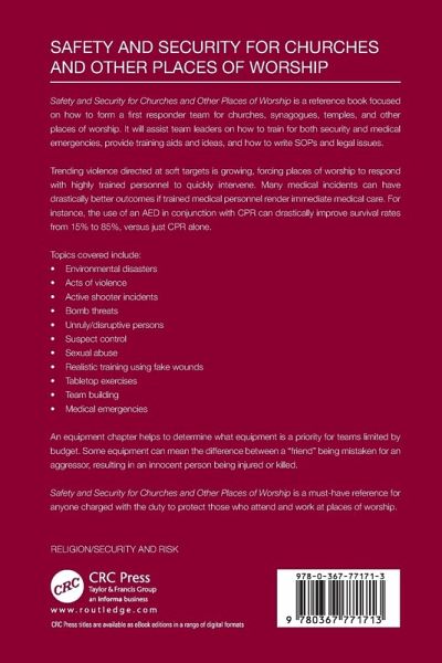 This reference book focuses on how to form a first responder team for churches, synagogues, temples, and other places of worship. It will assist team leaders on how to train for both security and medical emergencies, provide training aids and ideas, and how to write SOPâ s and legal issues.