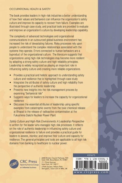 This book provides leaders in high risk industries a better understanding of how their values and behaviors can influence the organization's safety culture and improve its capacity to bounce back from failure. Examples are illustrated through case studies and practical tools are provided to evaluate and improve an organization's culture by improving leadership capability. This unique book integrates the areas of safety culture and high reliability from the perspective of leadership in a work team environment. Readers of the book will get a fresh perspective on safety culture and reliability that can be translated into practical steps for improving their organization through its leadership.