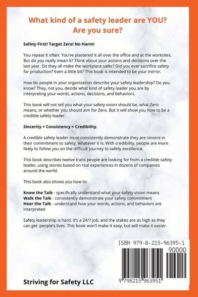 Safety First! Target Zero! No Harm! You repeat it often. You've plastered it all over the office and at the worksites. But do you really mean it? Think about your actions and decisions over the last year. Do they all make the workplace safer? Did you ever sacrifice safety for production? Even a little bit? This book is intended to be your mirror. How do people in your organization describe your safety leadership? Do you know? They, not you, decide what kind of safety leader you are by interpreting your words, actions, decisions, and behaviors. This book will not tell you what your safety vision should be, what Zero means, or whether you should aim for Zero. But it will show you how to be a credible safety leader. Sincerity + Consistency = Credibility. A credible safety leader must consistently demonstrate they are sincere in their commitment to safety, whatever it is. With credibility, people are more likely to follow you on the difficult journey to safety excellence. This book describes twelve traits people are looking for from a credible safety leader, using stories based on real experiences in dozens of companies around the world. This book also shows you how to:Know the Talk - specifically understand what your safety vision means Walk the Talk - consistently demonstrate your safety commitment Hear the Talk - understand how your words, actions, and behaviors are interpreted Safety leadership is hard. It's a 24/7 job, and the stakes are as high as they can get: people's lives. This book won't make it easy, but will make it easier.