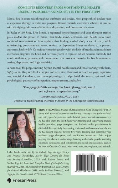 Complete recovery from most mental health issues is possible-and safety is the first step! Mental health issues exist throughout our brains and bodies. Most people think it takes years of expensive therapy to make any progress. Recent research shows how efficient it can be, with the right guide, to resolve anxiety, depression, and post-traumatic stress. In Safety in the Body, Erin Byron, a registered psychotherapist and yoga therapist trainer, gives readers the power to direct their body, mind, emotions, and beliefs away from continual traumatisation. Erin explains that finding a whole-body sense of safety while experiencing post-traumatic stress, anxiety, or depression brings us closer to a present, authentic, healthy life. Consciously practising safety with the help of breath and mindfulness exercises reprograms the brain and nervous system to regulate, which balances our body and mind. With time, patience, and commitment, this carries us towards a life free from trauma, anxiety, depression, and high sensitivity. A handbook for people moving beyond mental health issues and those working with them, Safety in the Body is full of strategies and activities. This book is based on yoga, expressive arts, empirical evidence, and neurophysiology. It helps build the neural, spiritual, and psychological pathways of integration, empowerment, and safety.