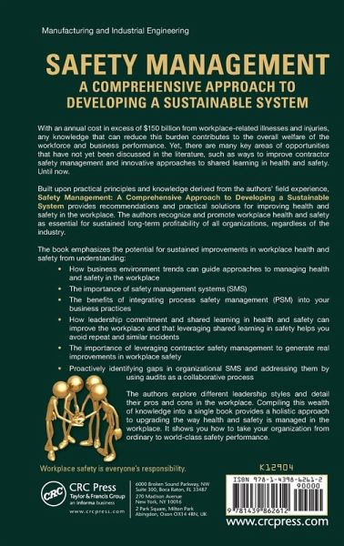 With annual cost in excess of $150 billion from workplace related illnesses and injuries, any knowledge that can reduce this burden contributes to the overall welfare of the work force and business performance. Yet, there are many key areas of opportunities that have not yet been discussed in the literature, such as approaches to improving contractor safety management and innovative approaches to shared learning in health and safety. Until now. Built upon practical principles and knowledge derived from the authors' field experience, Safety Management: A Comprehensive Approach to Developing a Sustainable System provides recommendations and practical solutions for improving health and safety in the workplace. The authors recognize and promote workplace health and safety as essential for sustained long-term profitability of all organizations, regardless of the industry. The book emphasizes the potential for sustained improvements in workplace health and safety from understanding: How business environment trends can guide approaches to managing health and safety in the workplace The importance of safety management systems (SMS) The benefits of integrating process safety management (PSM) into your business practices How leadership commitment and shared learning in health and safety can improve the workplace and that leveraging shared learning in safety helps you avoid repeat and similar incidents The importance of leveraging contractor safety management to generate real improvements in workplace safety Proactively identifying gaps in organizational SMS and addressing them by using audits as a collaborative process The authors explore different leadership styles and detail their pros and cons in the workplace. Compiling this wealth of knowledge into a single book provides a holistic approach to upgrading the way health and safety is managed in the workplace. It shows you how to take your organization from ordinary to world-class safety performance.