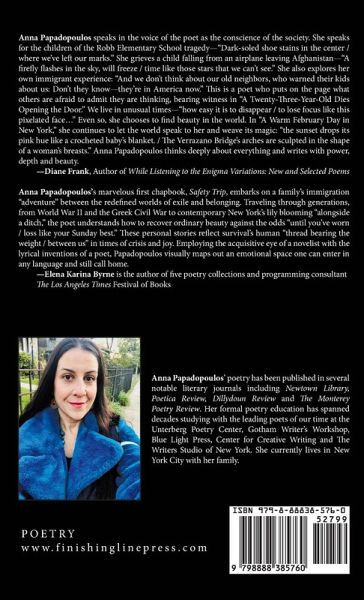 Anna Papadopoulos speaks in the voice of the poet as the conscience of the society. She speaks for the children of the Robb Elementary School tragedy-"Dark-soled shoe stains in the center / where we've left our marks." She grieves a child falling from an airplane leaving Afghanistan-"A firefly flashes in the sky, will freeze / time like those stars that we can't see." She also explores her own immigrant experience: "And we don't think about our old neighbors, who warned their kids about us: Don't they know-they're in America now." This is a poet who puts on the page what others are afraid to admit they are thinking, bearing witness in "A Twenty-Three-Year-Old Dies Opening the Door." We live in unusual times-"how easy it is to disappear / to lose focus like this pixelated face..." Even so, she chooses to find beauty in the world. In "A Warm February Day in New York," she continues to let the world speak to her and weave its magic: "the sunset drops its pink hue like a crocheted baby's blanket. / The Verrazano Bridge's arches are sculpted in the shape of a woman's breasts." Anna Papadopoulos thinks deeply about everything and writes with power, depth and beauty. -Diane Frank, Author of While Listening to the Enigma Variations: New and Selected Poems Anna Papadopoulos's marvelous first chapbook, Safety Trip, embarks on a family's immigration "adventure" between the redefined worlds of exile and belonging. Traveling through generations, from World War II and the Greek Civil War to contemporary New York's lily blooming "alongside a ditch," the poet understands how to recover ordinary beauty against the odds "until you've worn / loss like your Sunday best." These personal stories reflect survival's human "thread bearing the weight / between us" in times of crisis and joy. Employing the acquisitive eye of a novelist with the lyrical inventions of a poet, Papadopoulos visually maps out an emotional space one can enter in any language and still call home. -Elena Karina Byrne is the author of five poetry collections and programming consultant The Los Angeles Times Festival of Books