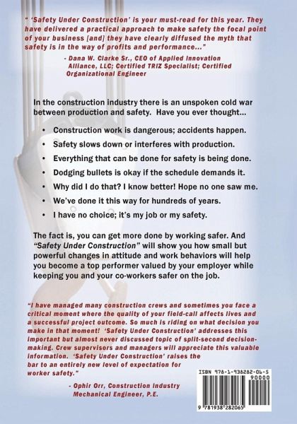 How to Make Your Safety the Key to Construction Profits and Schedule Performance. Although there are bright spots, the prevailing safety condition within the construction industry is bleak because people continue to be injured or killed in the workplace. The attitudes and hidden mindsets that create this condition are: (1). Safety is seen to slow down and even interfere with production; (2). People believe that everything reasonable that can be done is already being done; (3). We are dodging bullets and that can only work for so long; and (4). People behave strangely; don't think ahead; don't always do the right thing. The fact of the matter is you can get to zero-harm if you approach the goal scientifically, systematically, using problem-solving skills, and persisting until you get what you want. This book offers new tools and introduces the behaviors and mindsets you need to solve the most challenging safety related issues within your organization. See what other have to say: " 'Safety Under Construction' is your must-read for this year. They have delivered a practical approach to make safety the focal point of your business [and] They have clearly diffused the myth that safety is in theway of profits and performance" - Dana W. Clarke Sr., CEO of AIA, LLC; Certified TRIZ Specialist; Certified Organizational Engineer ALSO SEE: "I have managed many construction crews and sometimes you face a critical moment where the quality of your field-call affects lives and a successful project outcome. So much is riding on what decision you make in that moment! 'Safety Under Construction' addresses this important but almost never discussed topic of split-second decision-making. Crew supervisors and managers will appreciate this valuable information. 'Safety Under Construction' raises the bar to an entirely new level of expectation for worker safety." - Ophir Orr, Construction Industry Mechanical Engineer, P.E.