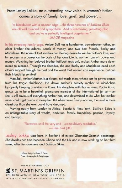 From Lesley Lokko, an outstanding new voice in women's fiction, comes a story of family, love, grief, and power . . . In this sweeping family saga, Amber Sall has the world on a platter---everything a girl could ever want. She has a handsome, powerbroker father, an older brother she adores, scads of money, and two best friends, Becky and Madeline. But none of that satisfies her lifelong desire to win her father's love, and for success in a career on the basis of her own talents, not her family's power and money. Watching her beloved brother fail both tests only makes Amber more determined to succeed. Through the decades, she and Becky and Madeline need each other's support through the best and the worst that women can experience, but can their friendship survive? Max Sall, Amber's father, is a distant, self-made man, whose lust for power comes from his tragic childhood. He drove Amber's society mother to alcoholism by openly keeping a mistress in Rome. His daughter with that mistress, Paola Rossi, is spoiled by her mother. She grows up to be a beautiful, glamorous member of the international jet set, yet she is still envious of everything Amber has, and determined to do what her mother never could: get a man to marry her. But when Paola finally marries, the result is more disastrous than she ever could have dreamed. Moving easily from London to Africa, Bosnia to New York, Saffron Skies is an unforgettable story of wealth, ambition, family, friendship, passion, loyalty, and betrayal.
