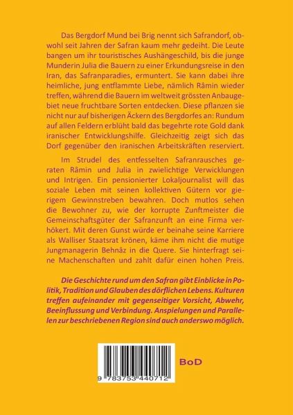 Das Bergdorf Mund bei Brig nennt sich Safrandorf, obwohl seit Jahren der Safran kaum mehr gedeiht. Die Leute bangen um ihr touristisches Aushängeschild, bis die junge Munderin Julia die Bauern der Safranzunft zu einer Erkundungsreise in den Iran, dem Safranparadies, ermuntert. Sie kann dabei ihre heimliche, jung entflammte Liebe, nämlich Râmin wieder treffen, während die Bauern in diesem weltweit grössten Anbaugebiet neue fruchtbare Sorten entdecken. Diese pflanzen sie nicht nur auf bisherigen Äckern des Bergdorfes an: Rundum auf allen Feldern erblüht bald das begehrte rote Gold dank iranischer Entwicklungshilfe. Gleichzeitig zeigt sich das Dorf gegenüber den iranischen Arbeitskräften reserviert.Im Strudel des entfesselten Safranrausches geraten Râmin und Julia in zwielichtige Verwicklungen und Intrigen. Ein pensionierter Lokaljournalist will das soziale Leben mit seinen kollektiven Gütern vor gierigem Gewinnstsreben bewahren. Doch mutlos sehen die Bewohner zu, wie der korrupte Zunftmeister die Gemeinschaftsgüter der Safranzunft an eine Firma verhökert. Mit deren Gunst würde er beinahe seine Karriere als Walliser Staatsrat krönen, käme ihm nicht die mutige Jungmanagerin Behnâz in die Quere. Sie hinterfragt seine Machenschaften und zahlt dafür einen hohen Preis.Die Geschichte rund um den Safran gibt Einblicke in Politik, Tradition und Glauben des dörflichen Lebens. Kulturen treffen aufeinander mit gegenseitiger Vorsicht, Abwehr, Beeinflussung und Verbindung. Anspielungen und Parallelen zur beschriebenen Region sind auch anderswo möglich. "Ich habe den Roman mit viel Vergnügen gelesen. Er steckt voller wirklichkeitsnaher Elemente, was Land und Leute sowohl in Iran wie auch in der Schweiz, speziell im Wallis betrifft." Philippe Welti, ehemaliger Botschafter der Schweiz in Teheran.