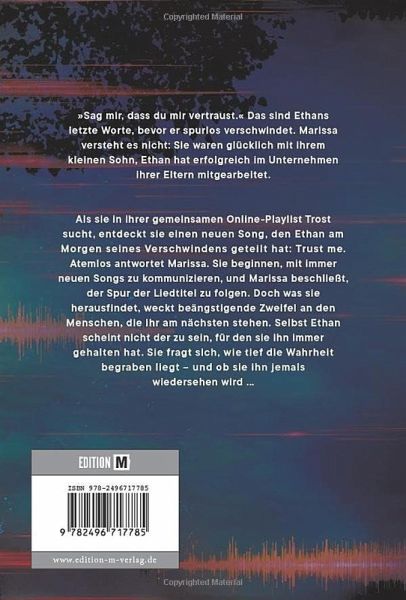 Als sie in ihrer gemeinsamen Online-Playlist Trost sucht, entdeckt sie einen neuen Song, den Ethan am Morgen seines Verschwindens geteilt hat: Trust me. Atemlos antwortet Marissa. Sie beginnen, mit immer neuen Songs zu kommunizieren, und Marissa beschließt, der Spur der Liedtitel zu folgen. Doch was sie herausfindet, weckt beängstigende Zweifel an den Menschen, die ihr am nächsten stehen. Selbst Ethan scheint nicht der zu sein, für den sie ihn immer gehalten hat. Sie fragt sich, wie tief die Wahrheit begraben liegt - und ob sie ihn jemals wiedersehen wird ...