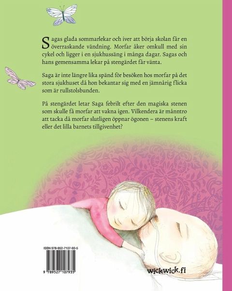 It's summertime and Stella is spending lots of time with Grandpa at a rock quarry. But when Grandpa has a bad bike accident, things change. Now Grandpa is lying in the hospital with a serious injury. No one is quite sure how to help Grandpa until Stella gets a wonderful idea. She will go back to the quarry and locate a magic stone! --- Sagas glada sommarlekar och iver att börja skolan får en överraskande vändning. Morfar åker omkull med sin cykel och ligger i en sjukhussäng i många dagar. Sagas och hans gemensamma lekar på stengärdet får vänta. Saga är inte längre lika spänd för besöken hos morfar på det stora sjukhuset då hon bekantar sig med en jämnårig flicka som är rullstolsbunden. På stengärdet letar Saga febrilt efter den magiska stenen som skulle få morfar att vakna igen. Vilkendera är månntro att tacka då morfar slutligen öppnar ögonen - stenens kraft eller det lilla barnets tillgivenhet?
