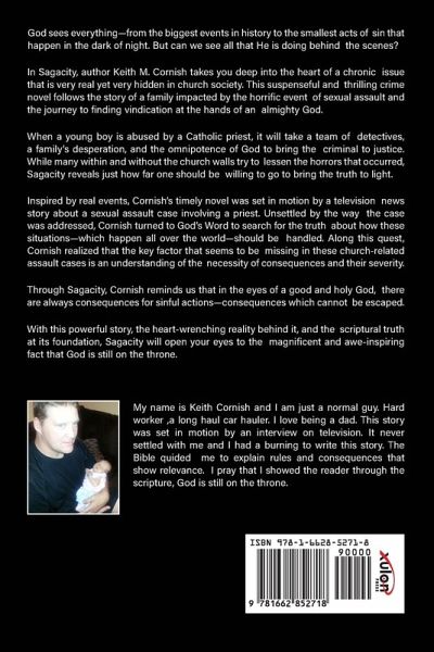 God sees everything-from the biggest events in history to the smallest acts of sin that happen in the dark of night. But can we see all that He is doing behind the scenes? In Sagacity, author Keith M. Cornish takes you deep into the heart of a chronic issue that is very real yet very hidden in church society. This suspenseful and thrilling crime novel follows the story of a family impacted by the horrific event of sexual assault and the journey to finding vindication at the hands of an almighty God. When a young boy is abused by a Catholic priest, it will take a team of detectives, a family's desperation, and the omnipotence of God to bring the criminal to justice. While many within and without the church walls try to lessen the horrors that occurred, Sagacity reveals just how far one should be willing to go to bring the truth to light. Inspired by real events, Cornish's timely novel was set in motion by a television news story about a sexual assault case involving a priest. Unsettled by the way the case was addressed, Cornish turned to God's Word to search for the truth about how these situations-which happen all over the world-should be handled. Along this quest, Cornish realized that the key factor that seems to be missing in these church-related assault cases is an understanding of the necessity of consequences and their severity. Through Sagacity, Cornish reminds us that in the eyes of a good and holy God, there are always consequences for sinful actions-consequences which cannot be escaped. With this powerful story, the heart-wrenching reality behind it, and the scriptural truth at its foundation, Sagacity will open your eyes to the magnificent and awe-inspiring fact that God is still on the throne. My name is Keith Cornish and I am just a normal guy. Hard worker ,a long haul car hauler. I love being a dad. This story was set in motion by an interview on television. It never settled with me and I had a burning to write this story. The Bible quided me to explain rules and consequences that show relevance. I pray that I showed the reader through the scripture, God is still on the throne.