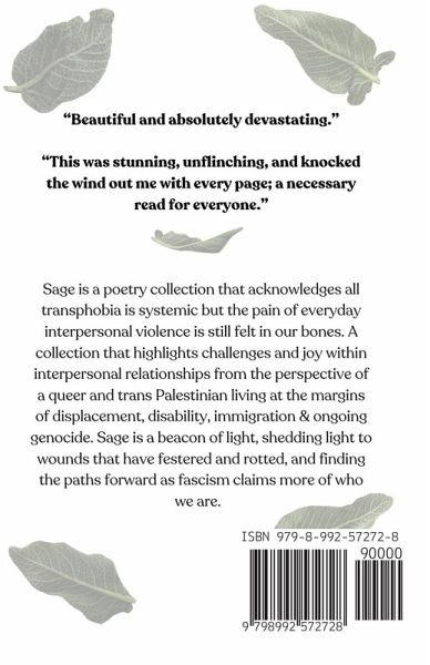 Sage is a poetry collection that acknowledges all transphobia is systemic but the pain of everyday interpersonal violence is still felt in our bones. A collection that highlights challenges and joy within interpersonal relationships from the perspective of a queer and trans Palestinian living at the margins of displacement, disability, immigration & ongoing genocide. Sage is a beacon of light, shedding light to wounds that have festered and rotted, and finding the paths forward as fascism claims more of who we are.