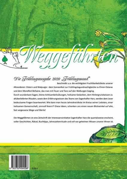 Die Frühlingsausgabe 2020 >Frühlingsmond< beschreibt u.a. die wichtigsten Fruchtbarkeitsfeste unserer Altvorderen: Ostern und Walpurgis - dem Sonnenfest zur Frühlingstagundnachtgleichen zu Ehren Ostaras und dem Mondfest Beltaine, das man mit Feuer und Tanz auf den Walburgen beging. Durch wunderbare Sagen, kleine Achtsamkeitsübungen, heilsame Gedanken, dem Hintergrundwissen zu altüberlieferten Ritualen, sowie dem Erfahrungswissen des Teams von Sagenhafter Harz, werden dem Leser bedeutsame Fragen beantwortet: Wie kann man heute Jahreskreisfeste im Kreise seiner Liebsten, einer heilsamen Gemeinschaft, sinnvoll feiern?! Diese Ideen, schenken uns einen neuen Blickwinkel auf alte, fast vergessene Wege und Werte!Die Weggefährten ist eine Zeitschrift der Interessensinitiative Sagenhafter Harz die quartalsweise erscheint, voller Geschichten, Rätsel, Buchtipps, Jahreszeitenrituale und voll von geheimem Wissen unserer Ahnen ist.
