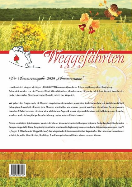 Die Sommerausgabe 2020 >Sommersonne< widmet sich einigen wichtigen HEILKRÄUTERN unserer Altvorderen & ihrer mythologischen Bedeutung. Behandelt werden u.a. die Pflanzen Distel, Gänseblümchen, Gundermann, Hirtentäschel, Johanniskraut, Knoblauchsrauke, Löwenzahn, Storchenschnabel & nicht zuletzt der Wegerich.Wir gehen den Fragen nach, ob Pflanzen ein geheimes Innenleben, quasi eine Seele haben (wie u.a. Wohlleben & Storl behaupten) & weshalb oft exakt jene Pflanzen unmittelbar vor unserer Haustür wachsen, die wir zum Gesundwerden brauchen! Dabei kommen nicht nur eine Vielzahl von Sagen & unsere eigenen Erlebnisse mit Heilkräutern zur Sprache, sondern auch die langjährige Berufserfahrung zweier wahrer Kräuterhexen!Neben unzähligen Kräutersagen, werden dem Leser kleine Achtsamkeitsübungen, heilsame Gedanken & altüberlieferter Rezepte dargestellt. Diese Ausgabe ist damit eine wundervolle Ergänzung zu unserem Buch >Kräutersagen aus dem HarzSagen & Märchen als Weggefährten<, das Magazinder Interessensinitiative Sagenhafter Harz das quartalsweise erscheint, ist voller Geschichten, Buchtipps & voll von geheimem Kräuterwissen unserer Ahnen.