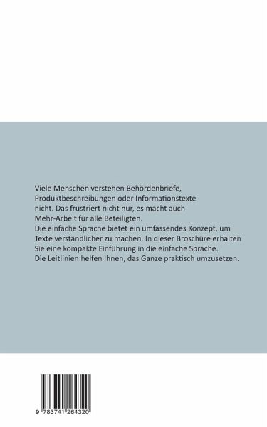 Viele Menschen verstehen Behördenbriefe, Produktbeschreibungen oder Informationstexte nicht. Das frustriert nicht nur, es macht auch Mehr-Arbeit für alle Beteiligten. Die einfache Sprache bietet ein umfassendes Konzept, um Texte verständlicher zu machen. In dieser Broschüre erhalten Sie eine kompakte Einführung in die einfache Sprache. Die Leitlinien helfen Ihnen, das Ganze praktisch umzusetzen.