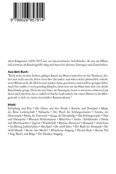 Alois Essigmann (1878-1937) war ein österreichischer Schriftsteller. Er war als Offizier und zeitweise als Kanzleigehilfe tätig und Autor bei diversen Zeitungen und Zeitschriften. Aus dem Buch: "Doch wehe: in dem dichten, giftigen Rauch des Harzes taumelten sie wie Trunkene, fanden sich nicht zurecht, fielen eines über das andere und wären sicher jämmerlich erstickt, wenn Bhima nicht alle fünf in seine starken Arme genommen und ins Freie getragen hätte. Auch hier mußte er noch gewaltig kämpfen, denn weit um das Haus hatte sich eine dichte Rauchhaube gelegt. Doch wie sein Vater, der Sturmgott, brach er mit seiner schweren Last durch das Unterholz, bis er endlich in frischer Luft anhielt. Im ersten Dämmern des Morgens sah er sich vor einem riesenhaften Banyanenbaum." Inhalt: . Schöpfung und Flut . Die Götter und ihre Feinde . Katscha und Dewajani . Mada, der Riese Leidenschaft . Nahuscha . Der Fluch der Schlangenmutter . Amrita, der Göttertrank . Patala, die Unterwelt . Ganga, die Dreipfadige . Das Schlangenopfer . Nala und Damayanti . Bharatas Heldenstamm . Bhischma . Amba - Schikhandin . Pandu und Dhrilarasehtra . Jugend . Feindschaft . Bhimas Abenteuer . Draupadi . Ardschuna . Großkönig Judhischthira . Das Spiel . Die zwölf Jahre . Der Raub der Draupadi . Die zwölf Monde . Recht oder Macht? . Bhischmas Ausgang . Dronas Ende . Karnas Tod . Sieg, Rache und Klage . Der Pandava Ausgang
