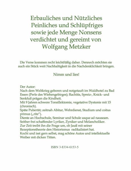 Erbauliches und Nützliches, Peinliches und Schlüpfriges sowie jede Menge Nonsens, verdichtet und gereimt von Wolfgang Metzker. Dieses Büchlein bringt auf vielerlei Weise Nutzen und Freude. Die Verse kommen recht leichtfüßig daher. Dennoch möchten sie auch ein Stück weit Nachhaltigkeit in die Nachdenklichkeit bringen. Den Friktionen zwischen Frau und Mann, die auch im jüngsten Millennium noch immer nicht aufgehoben sind, widmet der Autor ein eigenes Kapitel - mit Leidenschaft, jedoch ohne im Geschlechterkampf Partei zu ergreifen. Leben, lieben und sterben müssen wir alle mal. Auch dieser Fakt wird feinkörnig reflektiert. Damit nicht genug, macht sich der Autor auch die Alphabetisierungskampagne zu eigen und trägt dem Pisa-Debakel Rechnung.